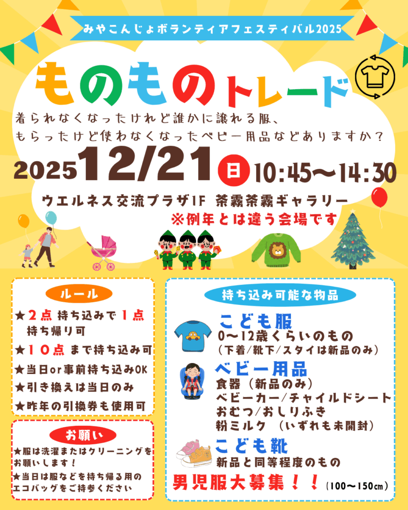 子育て中の皆さんが毎年楽しみにされている企画「ものものトレード」(こども用品の物々交換)!