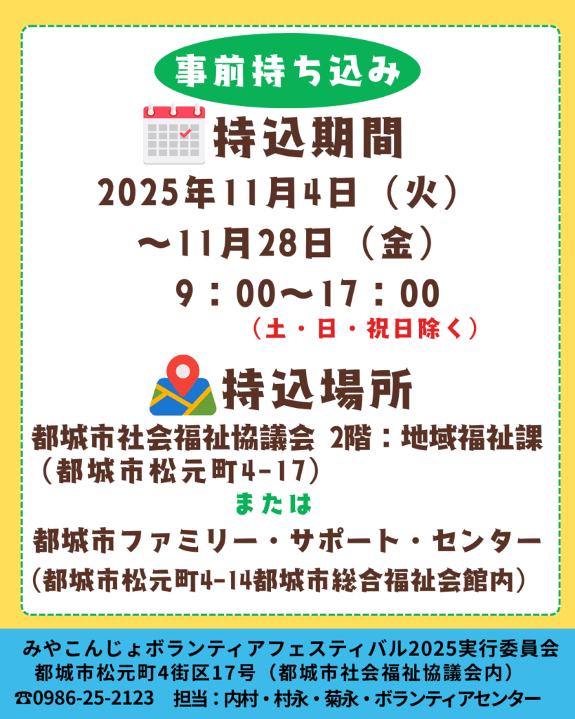 11/4(火)から物品の事前持ち込みが始まります。検討されている方は都城市社会福祉協議会 地域福祉課、もしくは都城市ファミリー・サポート・センターまでご持参ください。