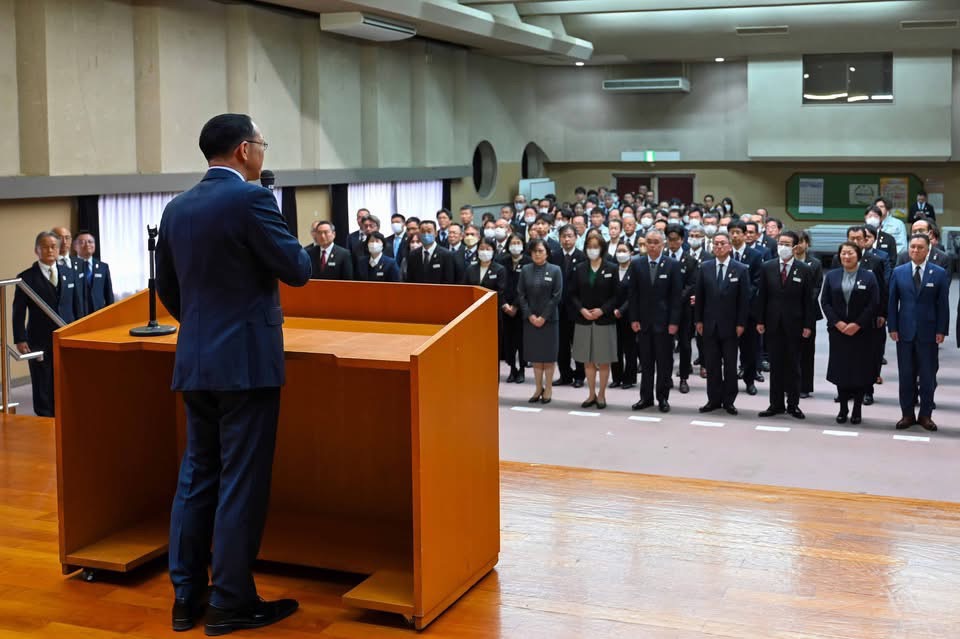 各課の職員が集まり、市長からのメッセージを受ける会場は、年明けらしい厳かな雰囲気。年末年始はたっぷり休み、心も体ものんびりだった分、背筋がすっと伸びる時間となりました。