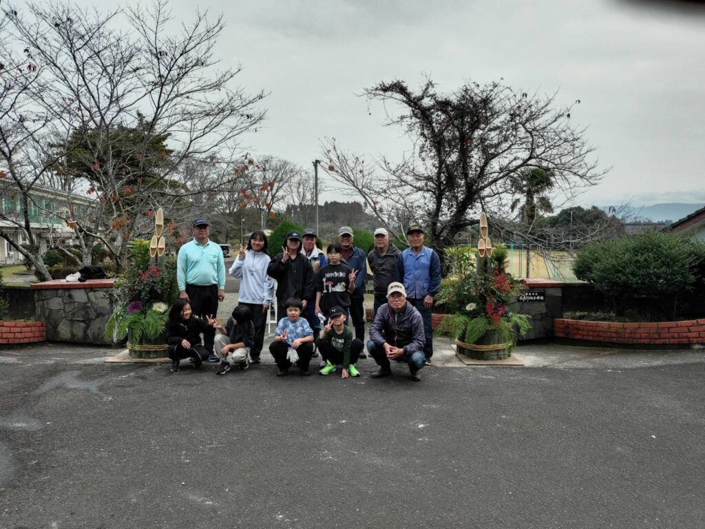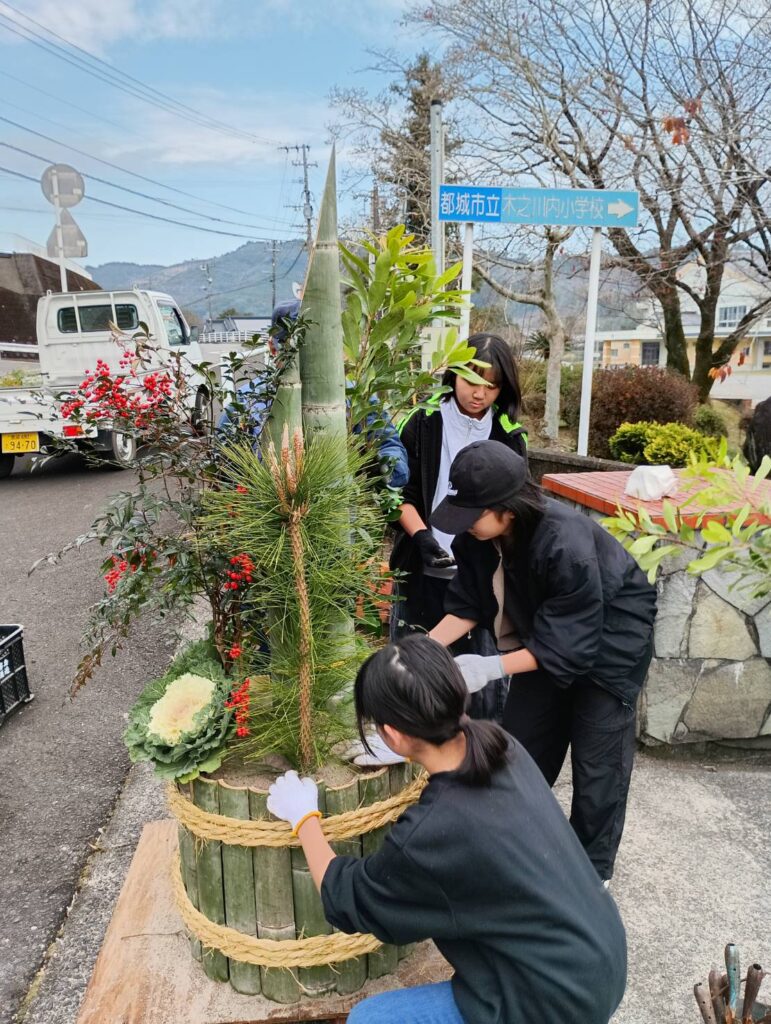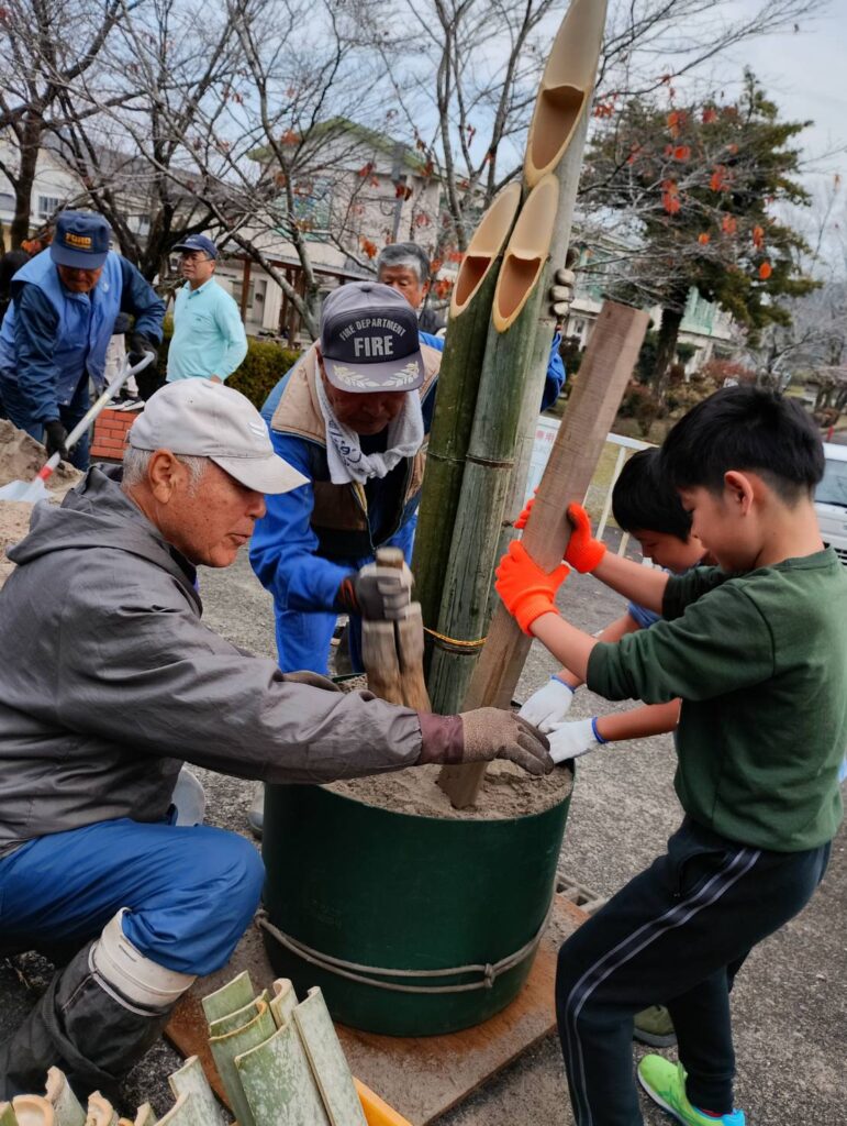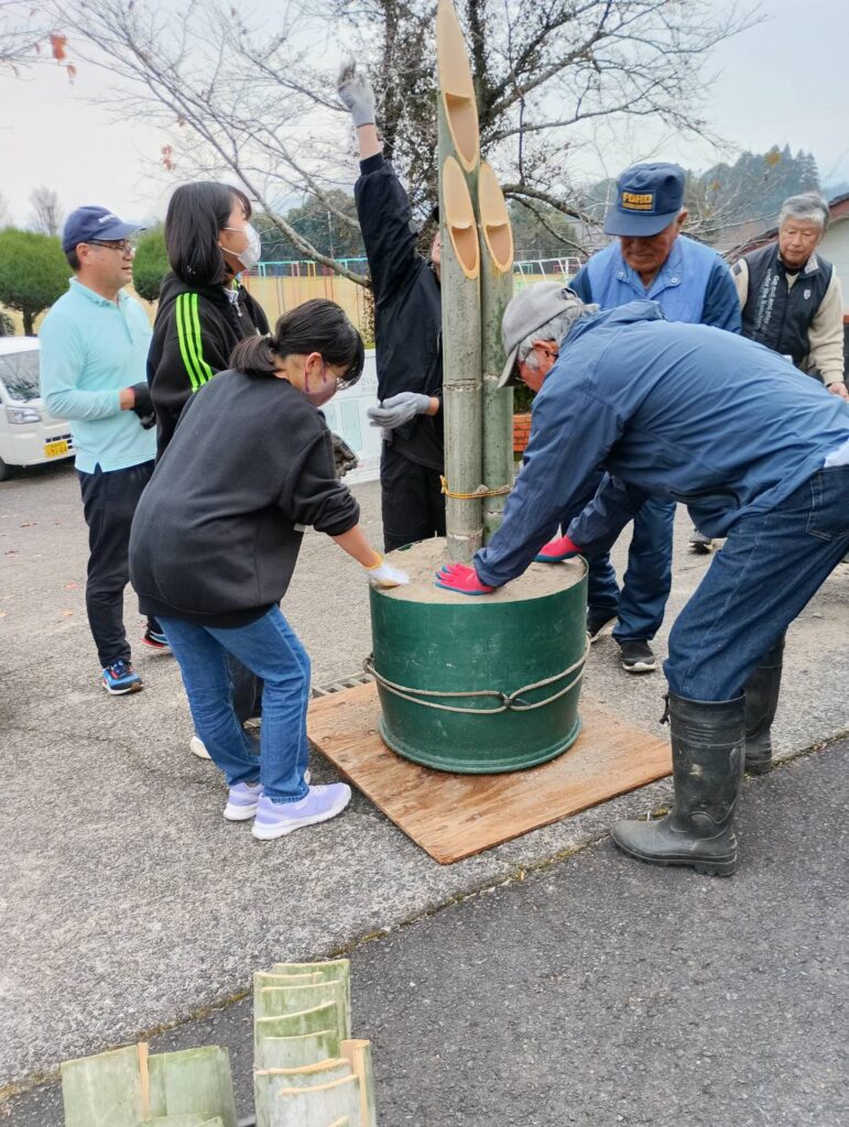 木之川内小学校で、学習支援「かかしっこ学習会」の一環として門松づくりが行われました。参加したのは児童と地域の大人たち。声を掛け合いながら、青竹を立てて協力して作業を進めました。