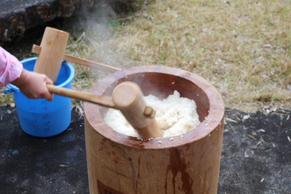 杵をしっかり握り、「よいしょ!」の掛け声とともにおもちをつく子どもたちの姿に、大人たちも思わずにっこり。できあがったおもちは丸めて仕上げ、つきたてならではの柔らかい味をみんなで楽しみました。