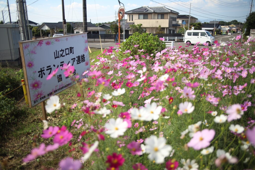 山之口町ボランティア連絡協議会の事業として、9月にまいたコスモスの花が満開を迎えました。