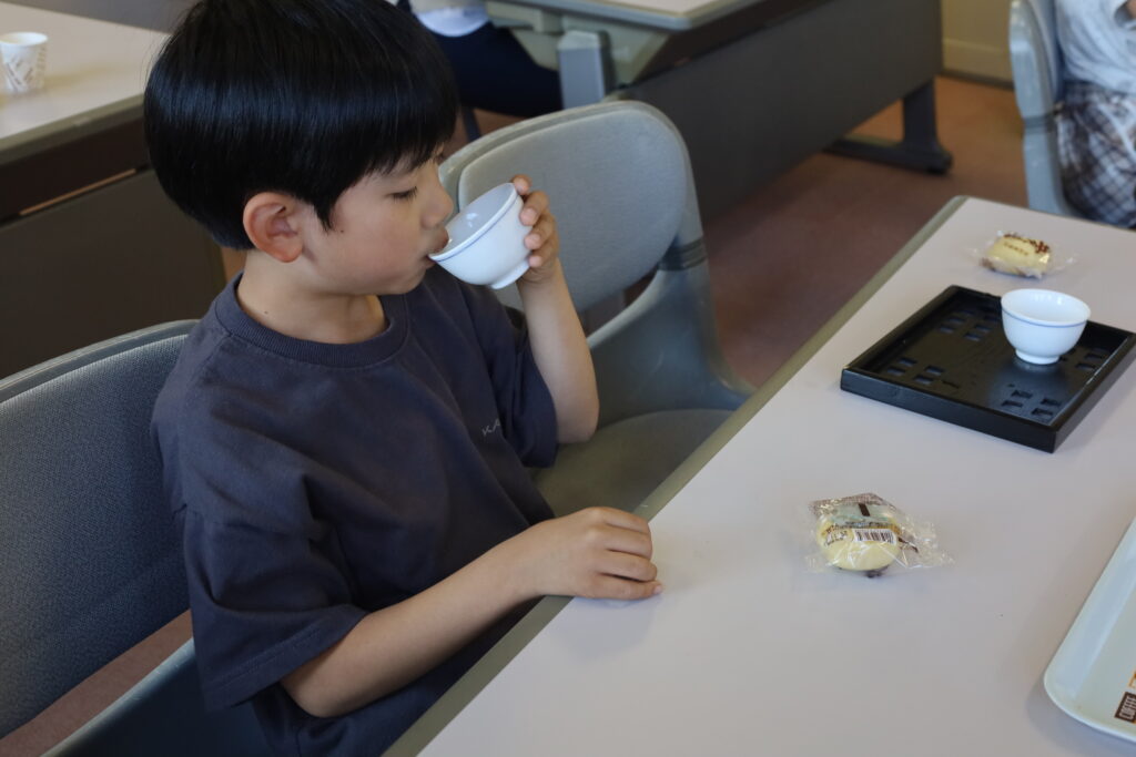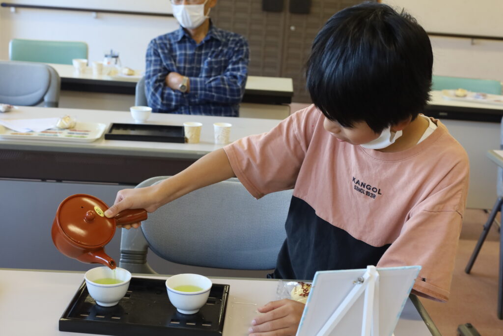 また、「美味しいお茶の入れ方講座」では、水出しとお湯出しの味の違いを飲み比べながら、お茶の深い香りや味わいを体験しました。ペットボトルのお茶が主流となっている今、子どもたちにとって“急須でお茶を入れる”ことは新鮮だったようで、興味を持って取り組む姿が見られました。