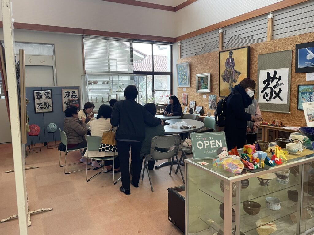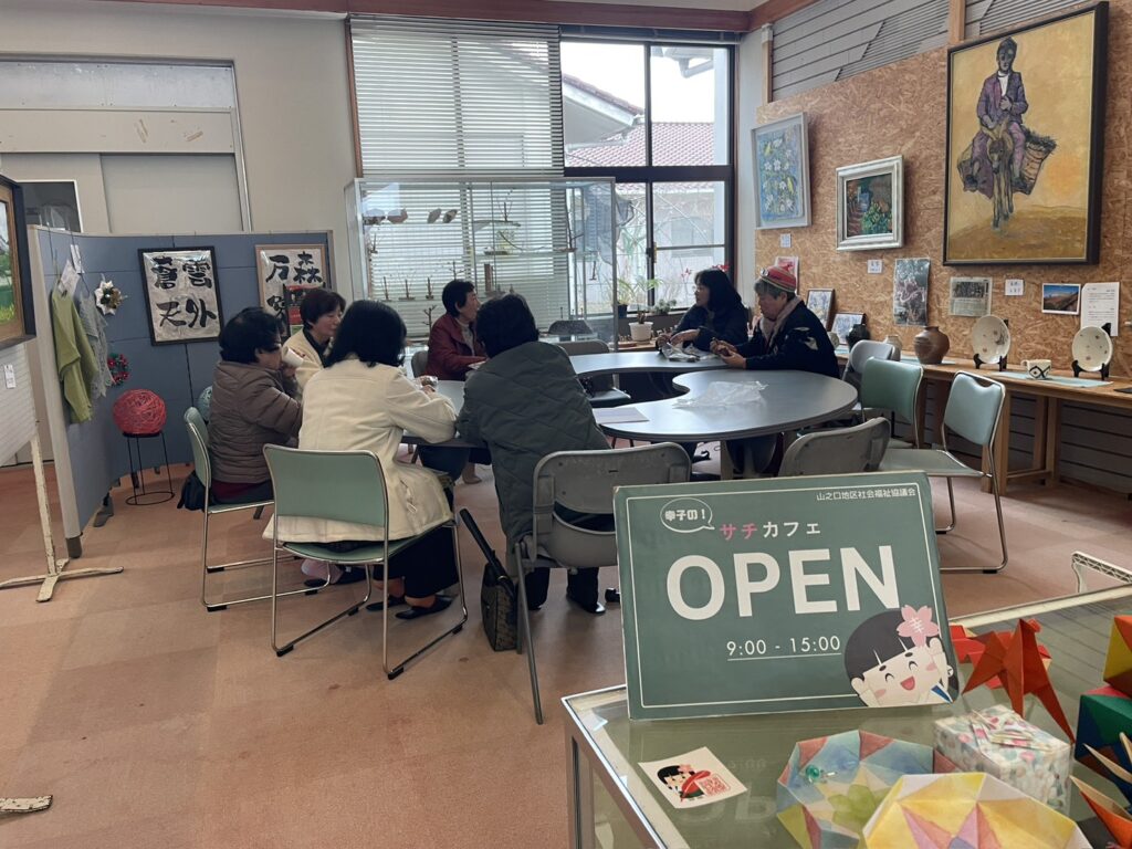 コミュニティカフェ「サチカフェ」は、毎週火曜日の地区社協開設日に合わせて開催しており、令和8年1月時点で52回実施しました。また、同会場で行っている「山之口地域住民美術作品展」のフリースペースは、年間135回活用され、延べ500名以上の方が利用しています。